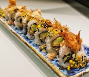 Tempura de cangrejo softshell , katsuobushi, furikake y salsa okonomiyaki...